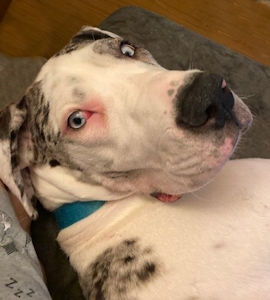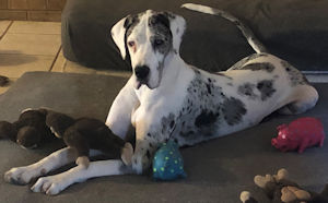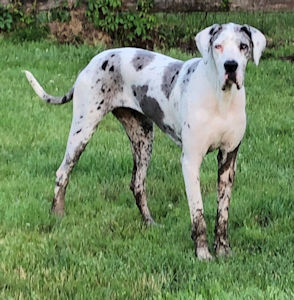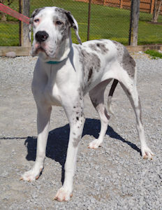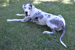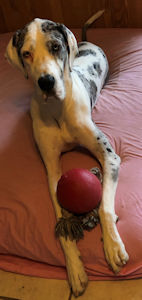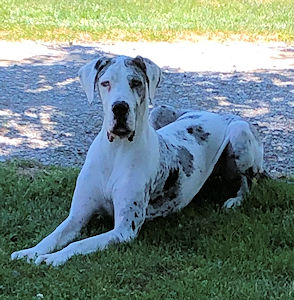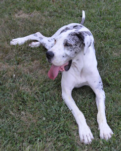 Faye Interested in adopting me? Click here for our >> Adoption Procedures I am looking for a forever home! I was purchased from a backyard breeder and than my owners gave me away to one of their friends who lived in an apartment with several other dogs and well I guess you figured it out I am now homeless again!! Grandma said I have to relax and so far that is really easy!! I have tons of toys and other Danes to play with and every time we go outside and come back inside there are either treats or food waiting for us!! I love food!! Well although I love playing on the computer Vanna Mae said it is time to go play so see ya!!