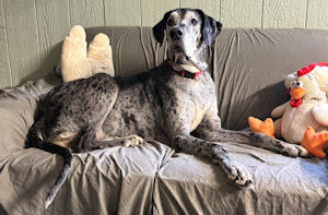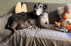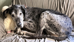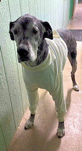 Vicky I have been in and out of the county shelters and finally in October the Darke County Humane Society said enough was enough. I weighed only 75 pounds when I went to the shelter. Lucky for me the Humane Society fed me and gave me lots of love until I could come to Harlequin Haven. Thank You Darke County Humane Society!! I am scheduled for a surgery to get a lump off the front of my left leg on Tuesday once I am healed I will be ready for adoption! Update 1/27: I had my surgery and am now home and resting. Grandma gave me a shirt to keep me from licking my sutures and I love my new shirt! Update 2/18: I am now ready for adoption!!! Please can you spare a